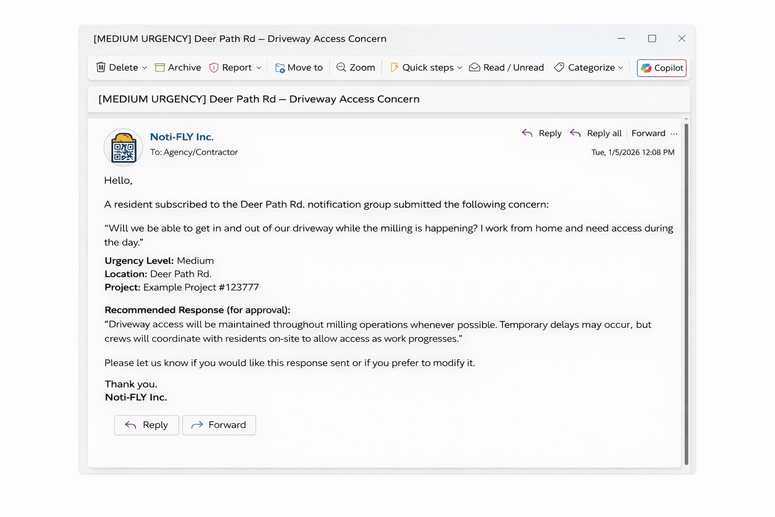 Noti-FLY relays resident concerns to the designated contractor contact by email, clearly identifying the project, location, and urgency level. A recommended response is provided for review, allowing contractors to address resident questions quickly and consistently without monitoring incoming text messages directly. Agencies remain informed and retain visibility into communications, without being required to manage day-to-day responses.