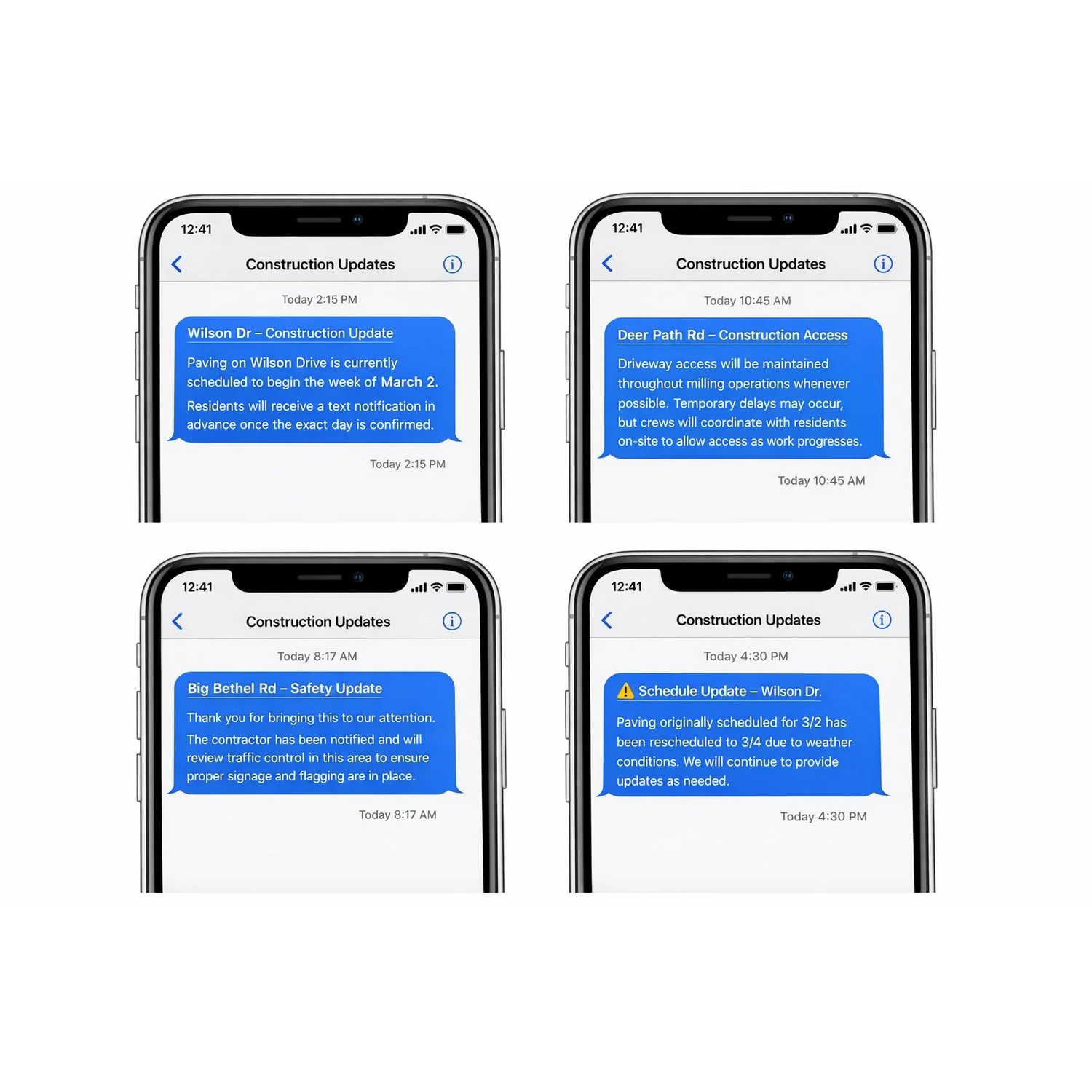 Noti-FLY provides agencies with a managed communication service that delivers clear, timely construction updates directly to residents via text message. Once residents opt in using a location-specific QR code, they receive project-specific notifications related to schedule changes, access impacts, lane closures, and safety information throughout the life of the project.