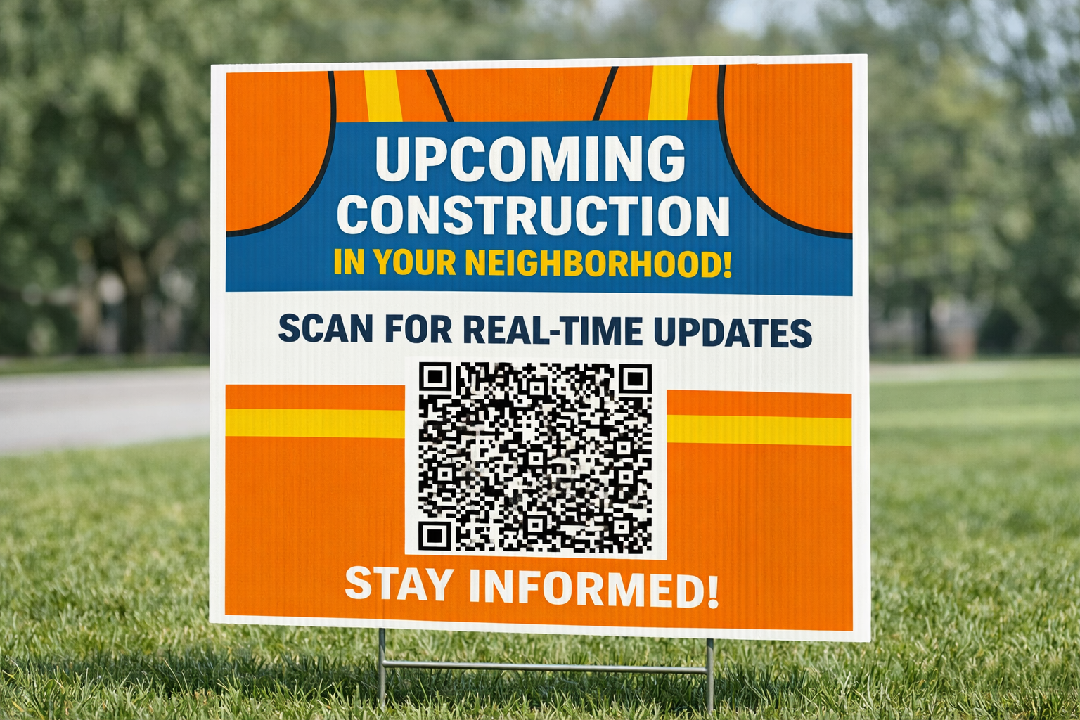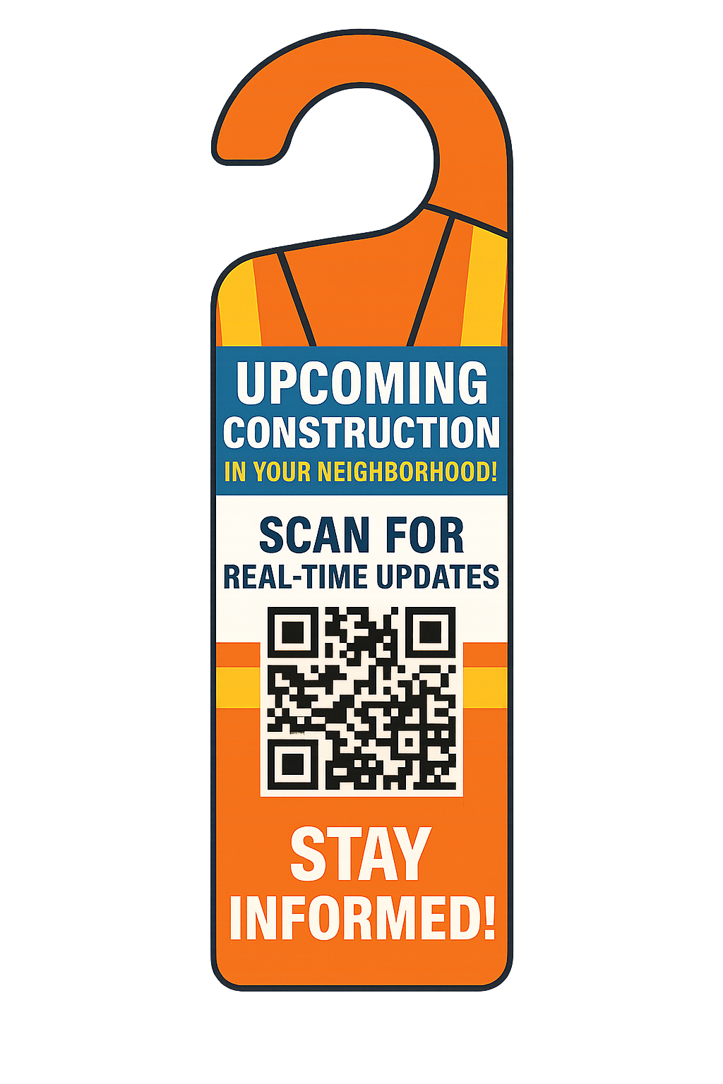 Agencies may opt for door hangers instead of mailed notifications, which can be provided directly to the contractor for on-site distribution—reducing or eliminating mailing and postage costs. In addition, project signage with QR codes can be produced for placement at construction entrances and throughout affected neighborhoods.